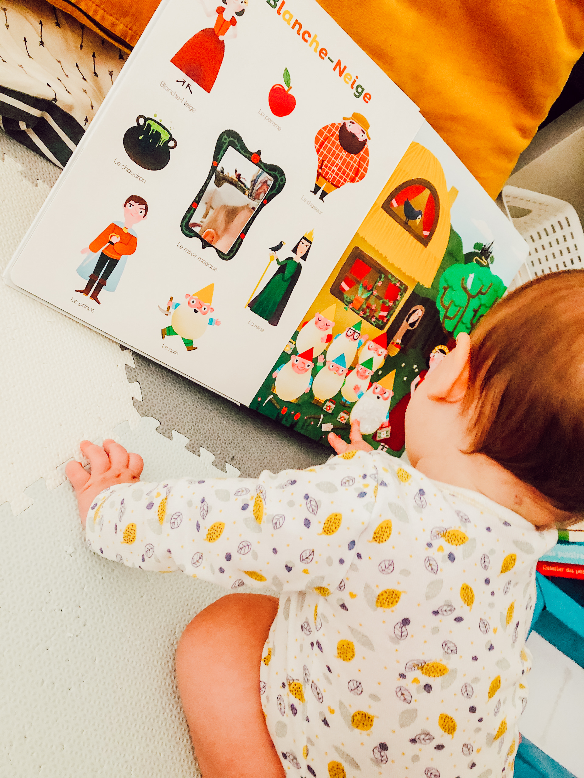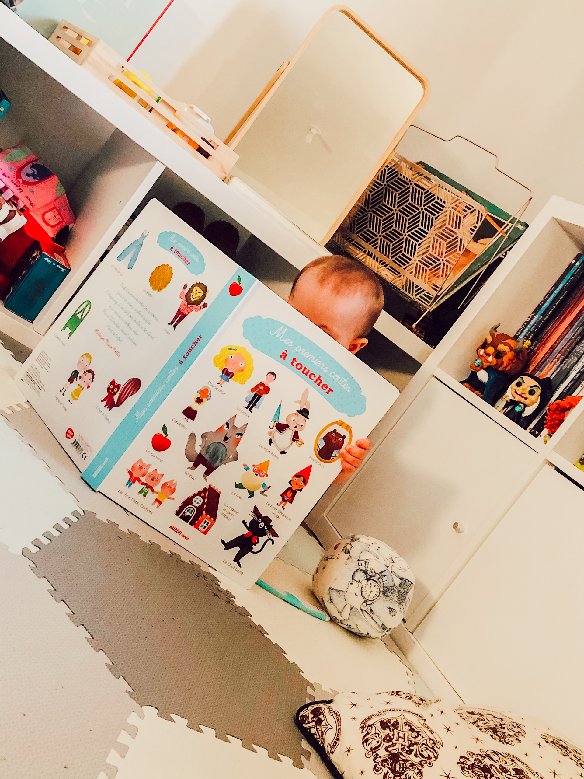 Que ce soit en voiture, dans le bain, sur la table à langer, dans la chambre ou le salon, il y a toujours un livre à porter de main. Impossible d’aller au lit sans avoir lu histoire avant! Cela fait partie de notre rituel du temps calme mais aussi coucher et je prends énormément de plaisir à partager ce moment-là avec elle.